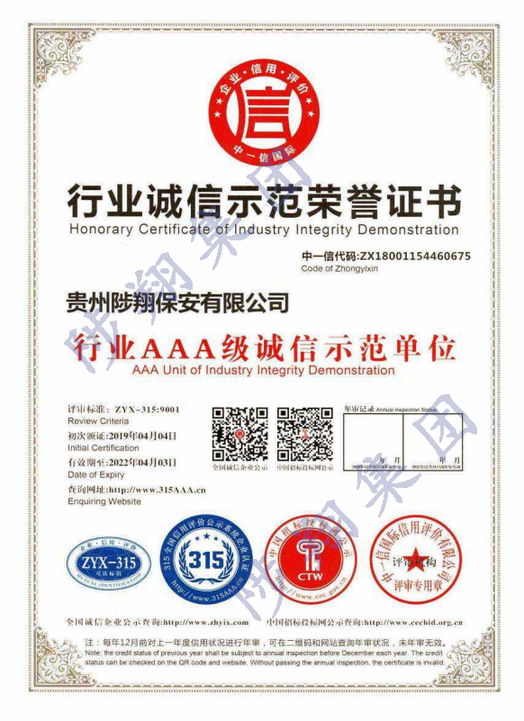 行業(yè)誠(chéng)信示范榮譽(yù)證書